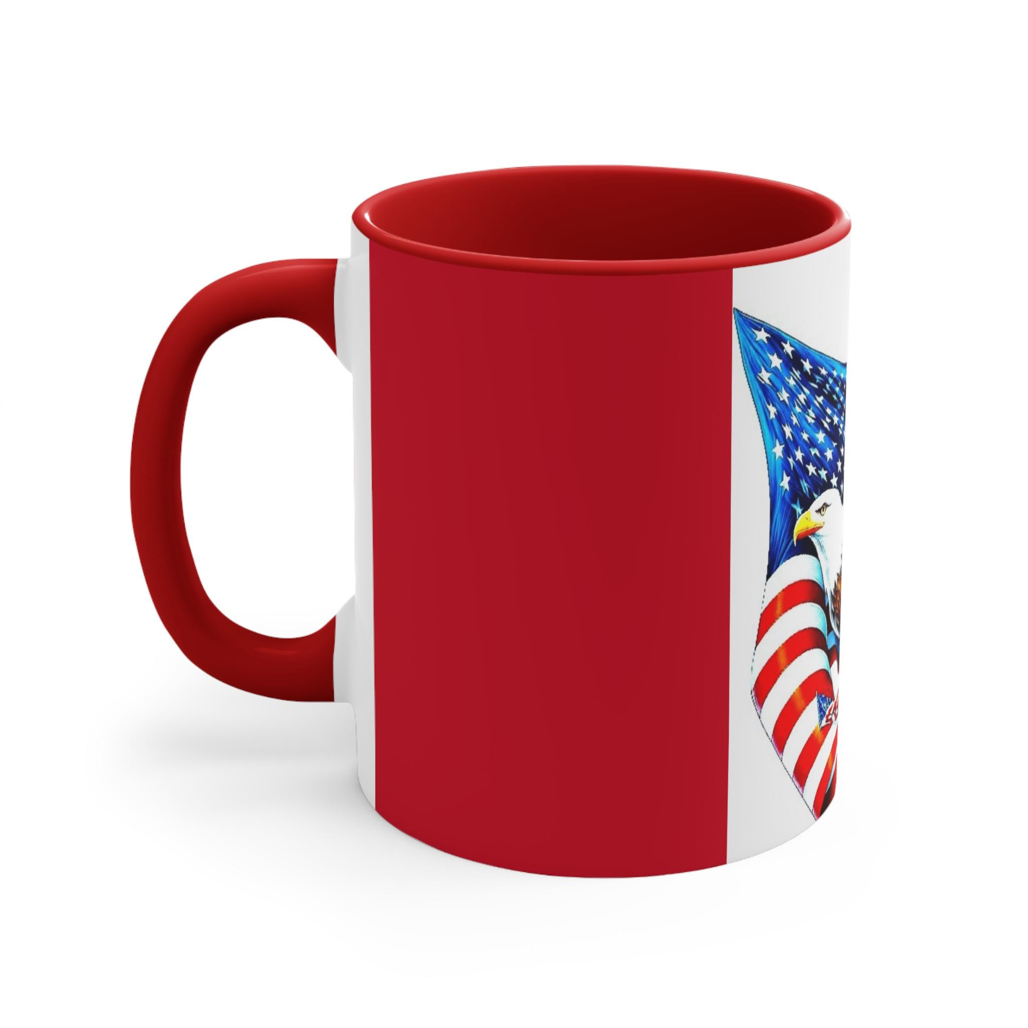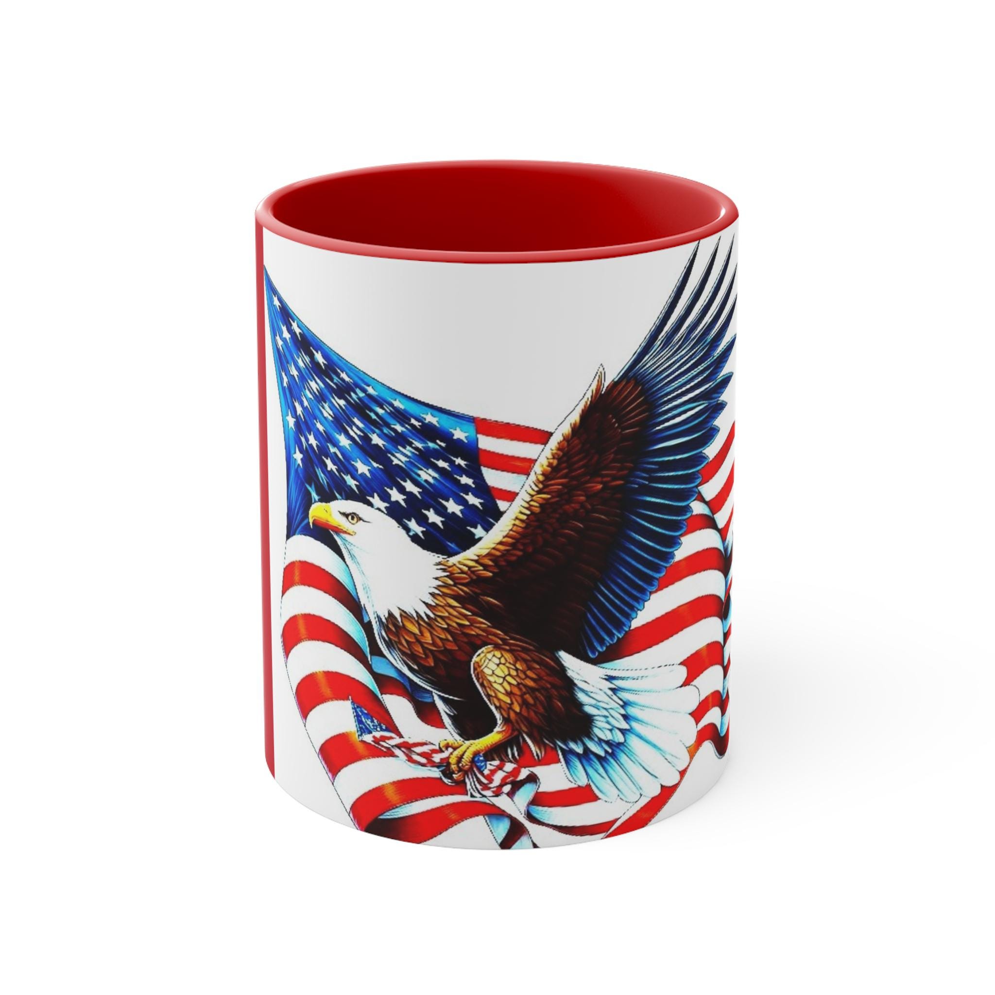 A bold, heart-forward mug that brings a rush of homeland pride to your morning routine. Bright inks and a glossy ORCA finish make the soaring bald eagle and waving American flag pop against the clean white exterior, while the colored interior and handle add a warm, finished touch. It sits comfortably in hand with a classic C-handle and rounded edges and holds a generous 11oz pour. Durable enough for daily use microwave and dishwasher safe it’s the kind of mug that becomes a quiet emblem on your desk or kitchen counter. Reach for it early mornings, during cold-weather coffee breaks, or anytime you want a small, steady reminder of home and heritage.