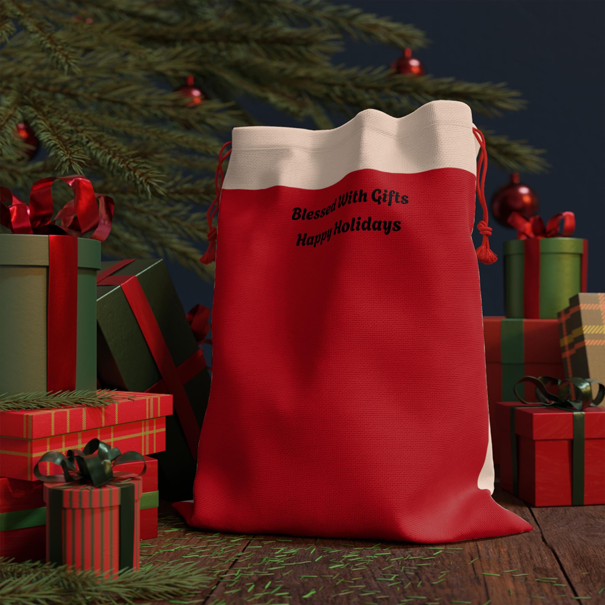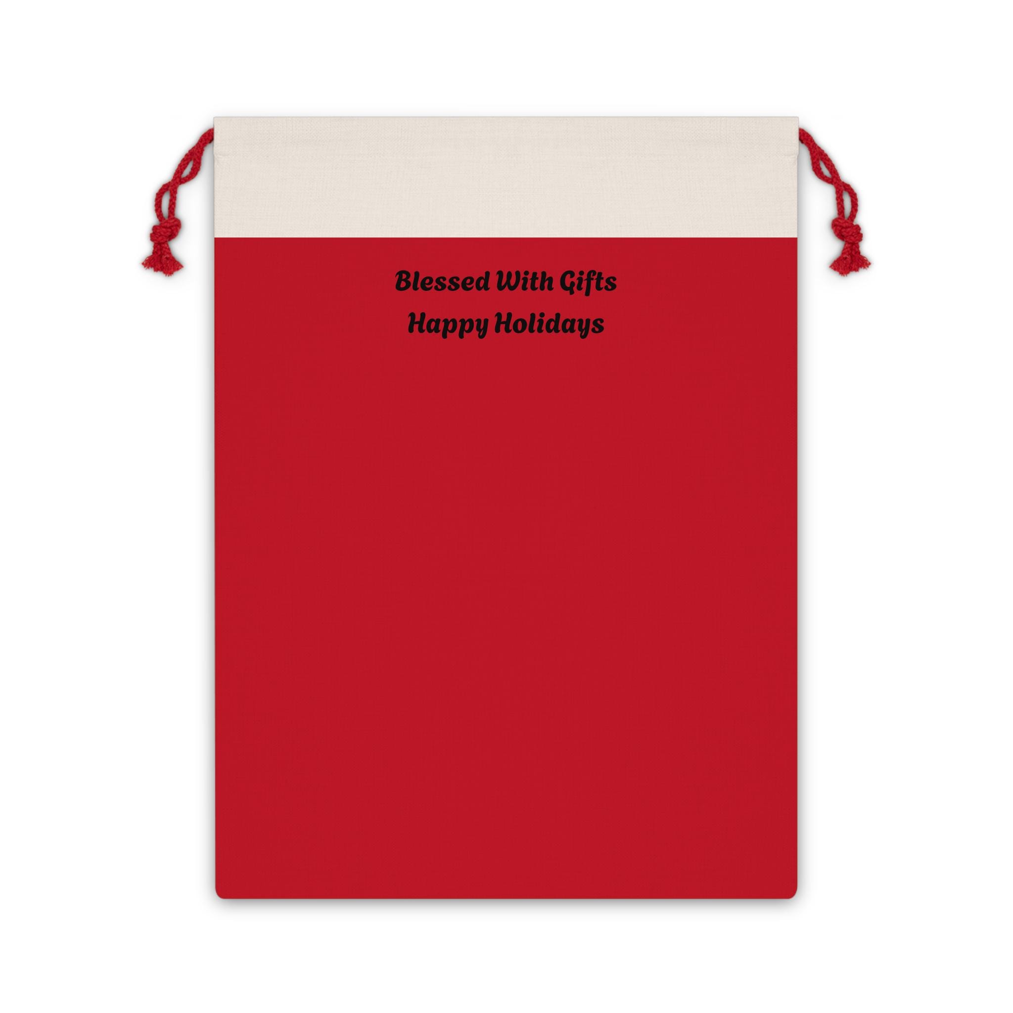 Product features - Sewn-in drawstring closure for secure, easy closing - Large single-size (19.7″ × 26″) holds multiple or bulky items - Durable blend: 95% polyester, 5% cotton with polyester drawstring - Vintage-inspired two-tone design with natural cuff and red body - Lightly textured fabric with subtle "Blessed with Gifts Happy Holidays" detail