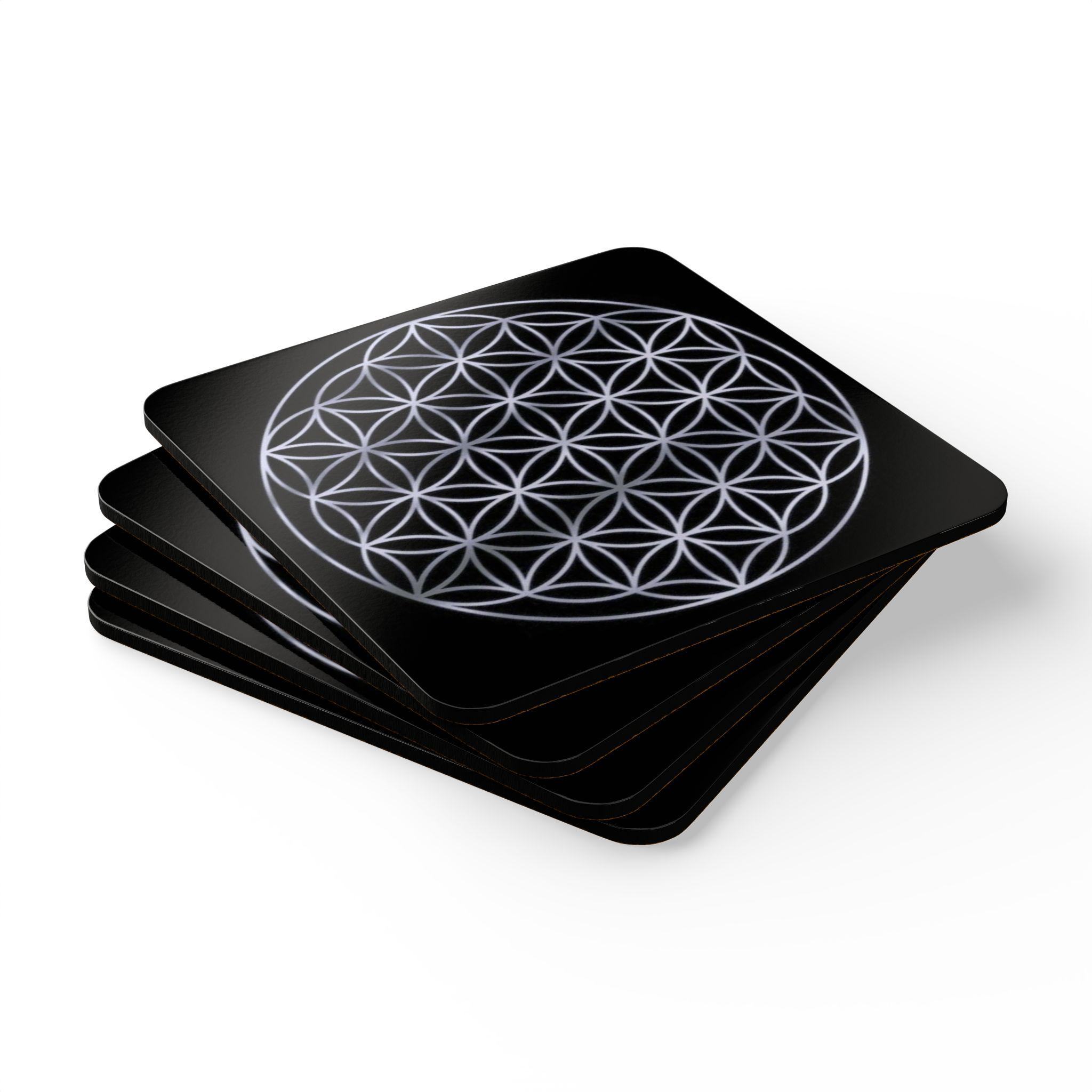 These stunning cork-backed coasters bring quiet geometry and everyday practicality to your table. Each 3.75" square features a high-gloss MDF top printed in vivid, high-contrast color. This design uses a luminous white Flower of Life motif that feels meditative and gives a modern style decor. The coaster is made strong and sits under mugs and glasses while the natural cork base grips surfaces and protects wood from heat and moisture damage. They arrive as a set of four, ready to anchor your coffee rituals, altar corners, or evening tea adding a small, intentional touch to moments when you want calm and order.