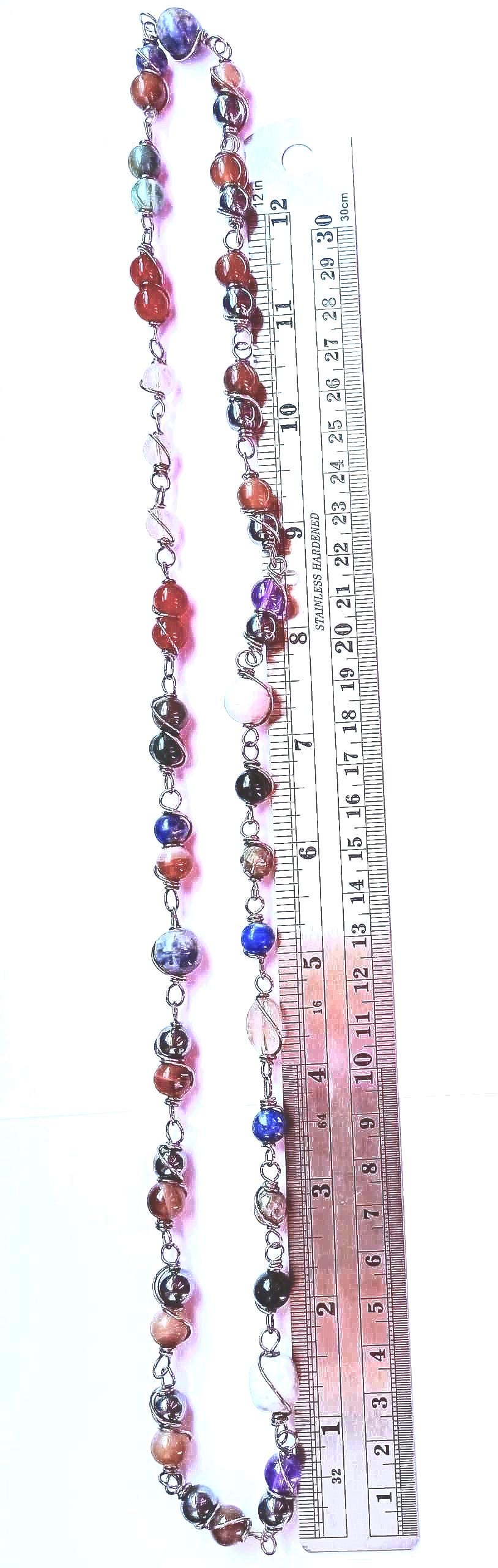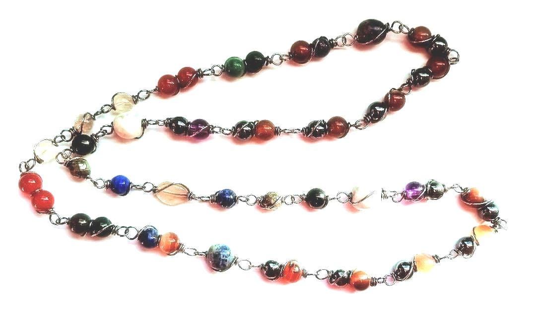 Make a statement with this stunning kaleidoscope of 50 real coiled wrapped gemstones. A fashion style vintage necklace look that goes with any outfit. Each stone is unique and genuine and made to go around your neck without a clasp or closure. Easy to put on and off effortlessly. Multiple stones incudes Amethyst, Lapis lazuli, Pyrite, Magnetic Hematite, and so much more as shown in the photo. This necklace ships in a secure jewelry box and ready for gifting on arrival. Signature required UPS delivery.