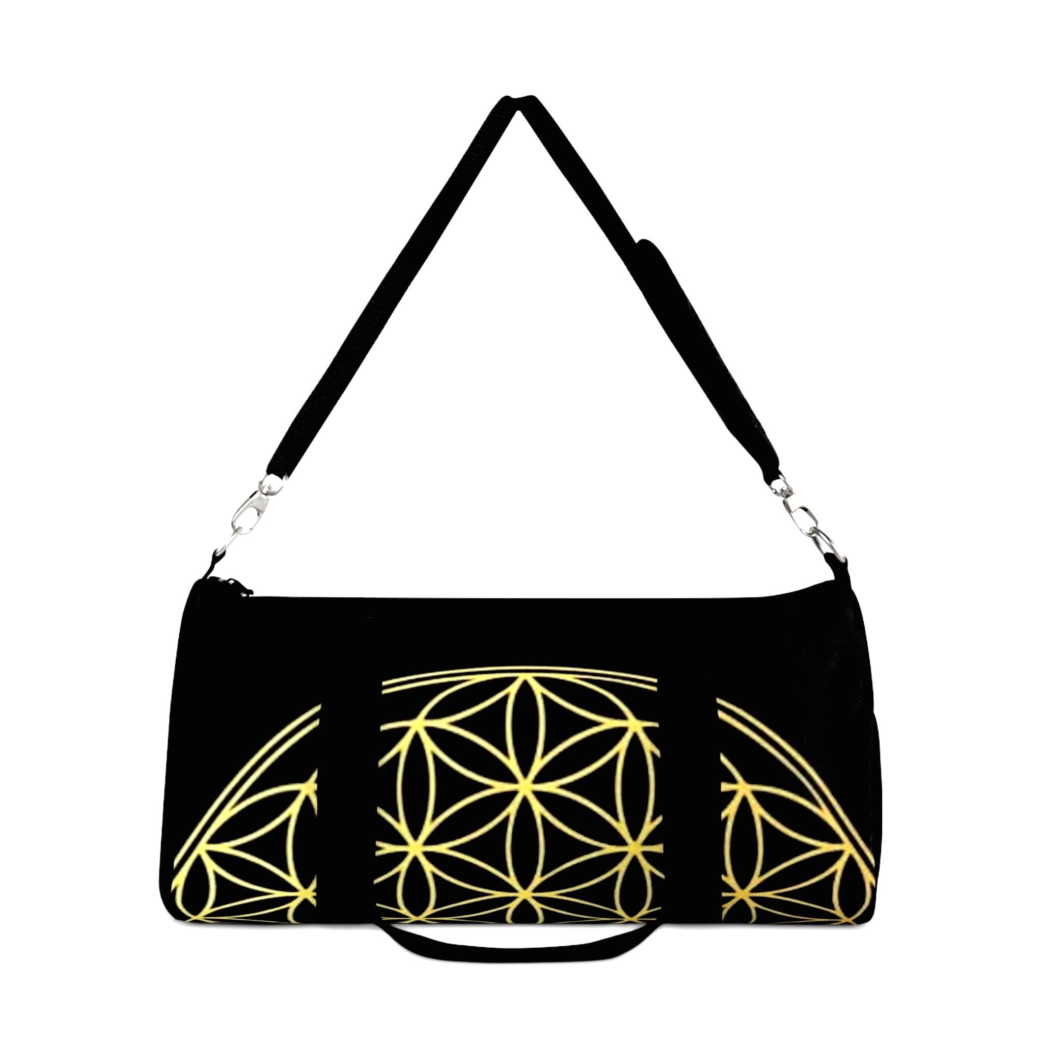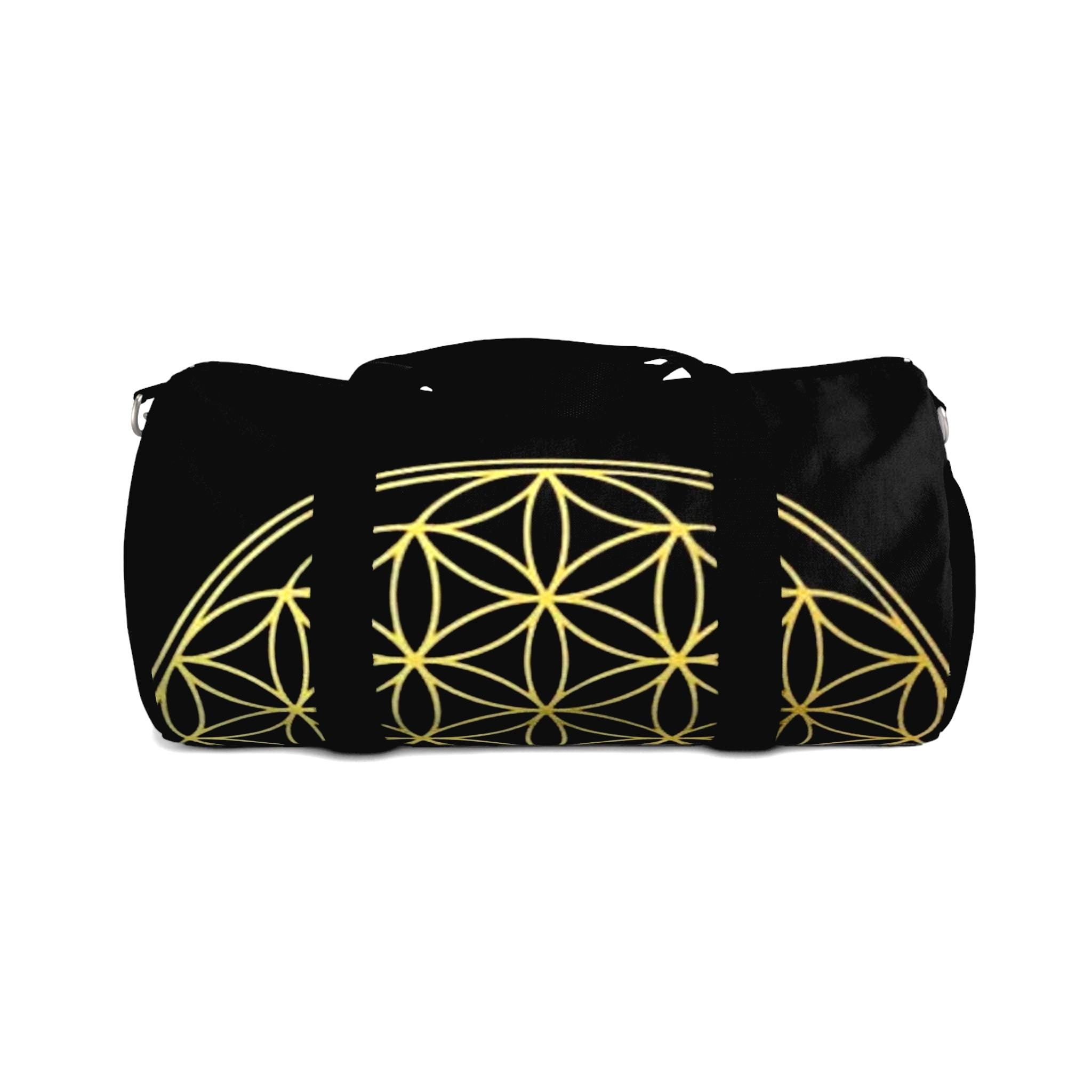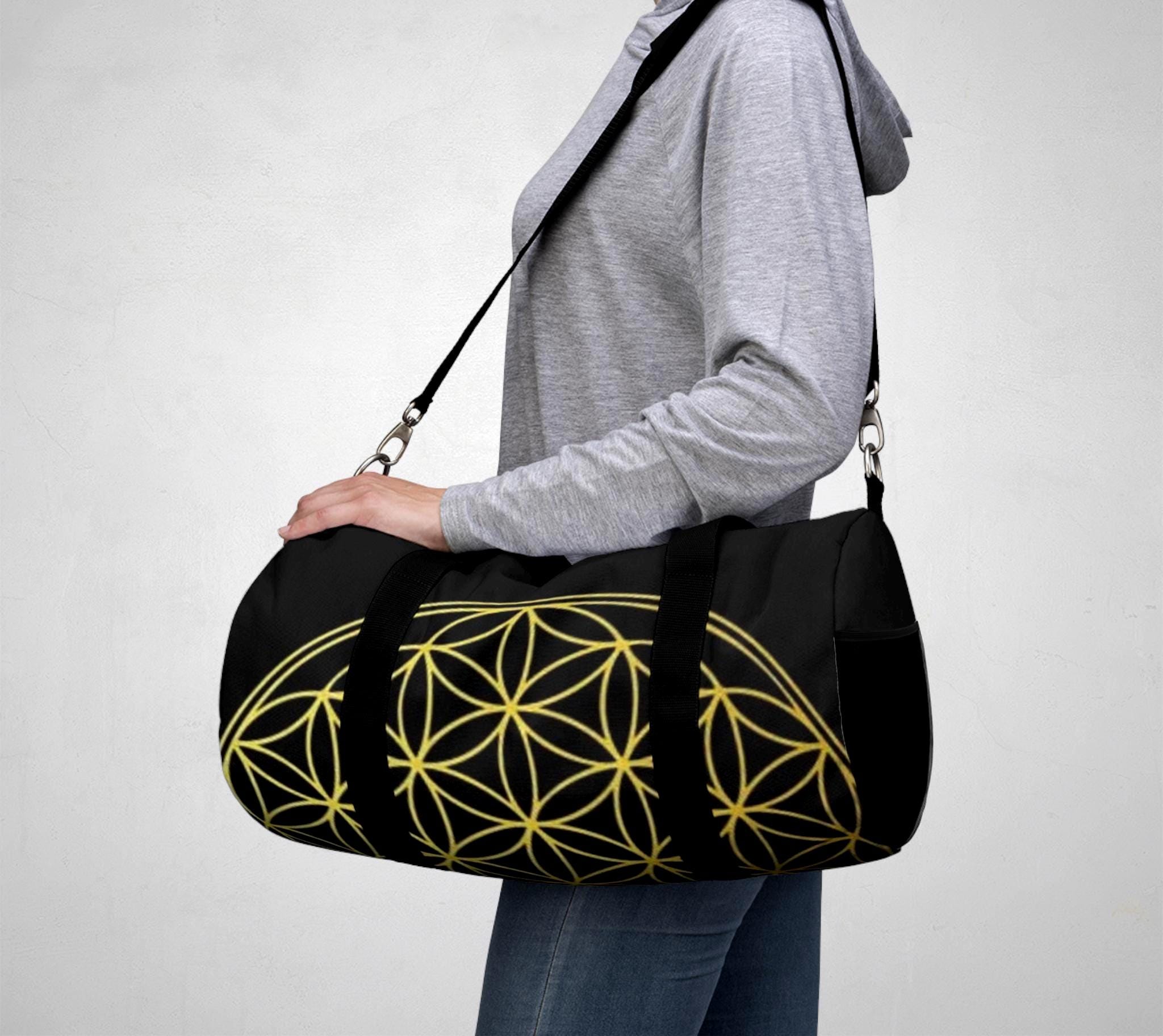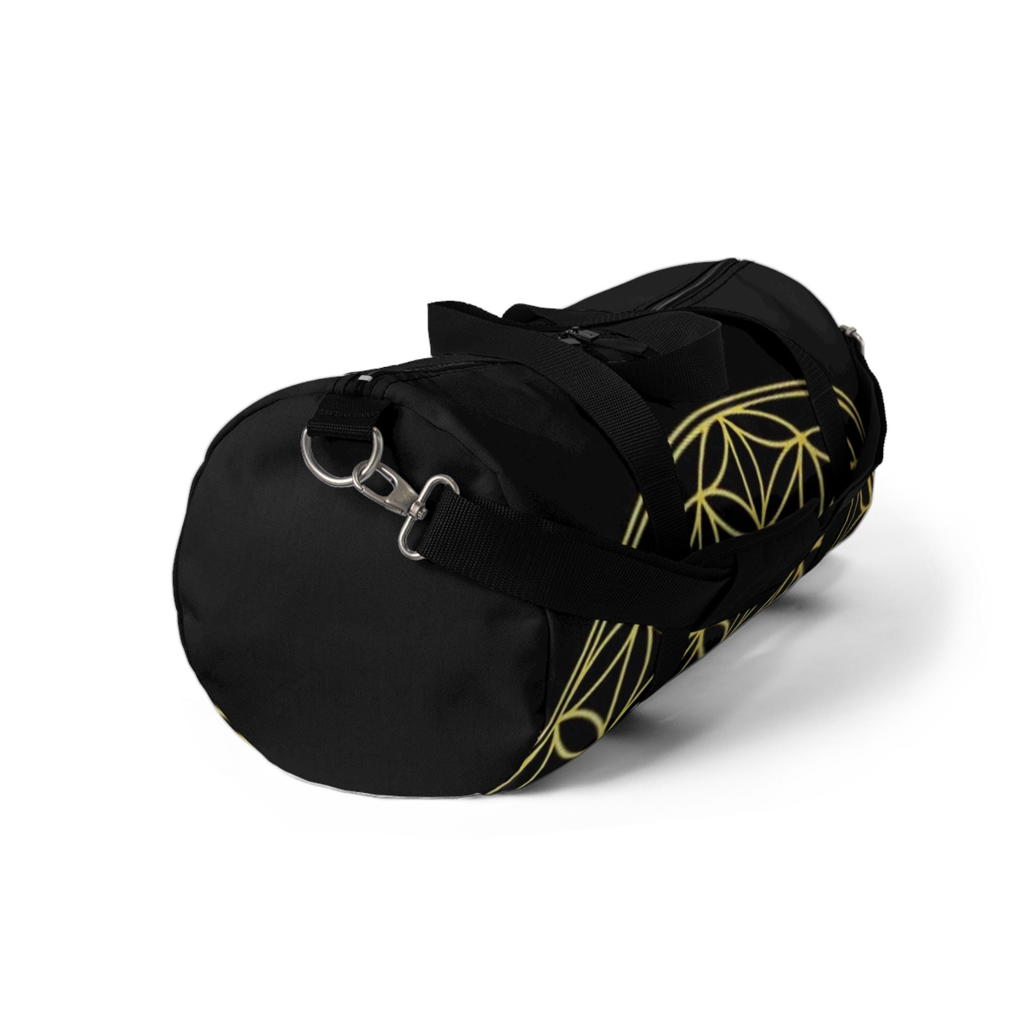 This black duffel carries quiet confidence. The gold geometric motif and interlocking circular pattern shimmers across the front like a talisman, turning functional luggage into a statement piece. Lightweight yet tough, the Oxford polyester body stands up to weekend escapes, gym rotations, and ritual commutes. Inside, a zippered pocket with a sewn name tag keeps small essentials anchored while the exterior mesh pocket holds a water bottle or quick access items. The adjustable, removable shoulder strap and brushed-nickel hardware let you switch between hands-free wear and grab-and-go. It feels intentional, grounded, and made to move with you.