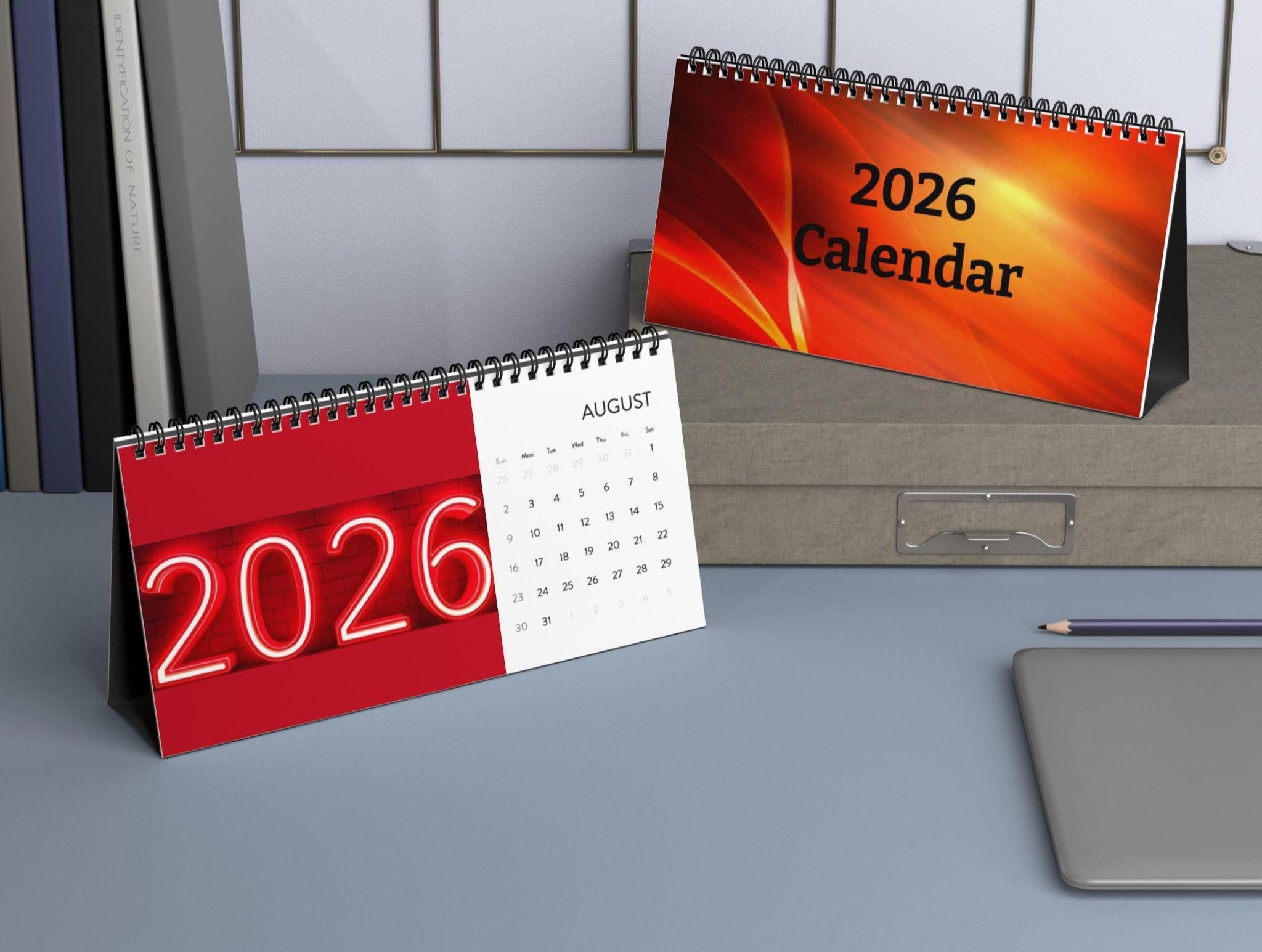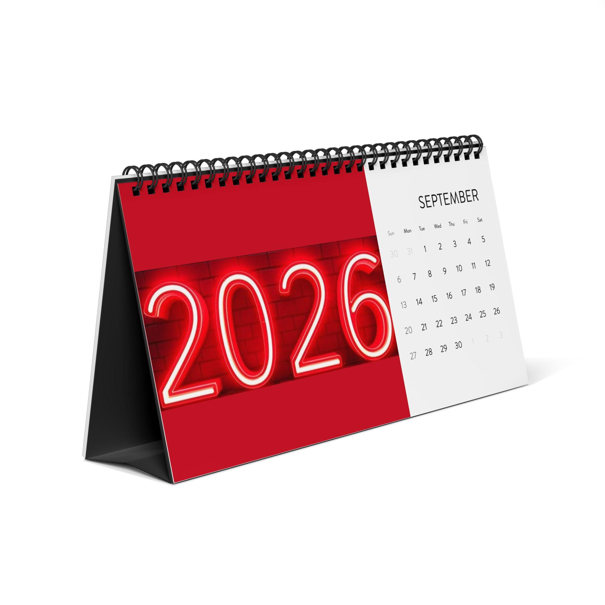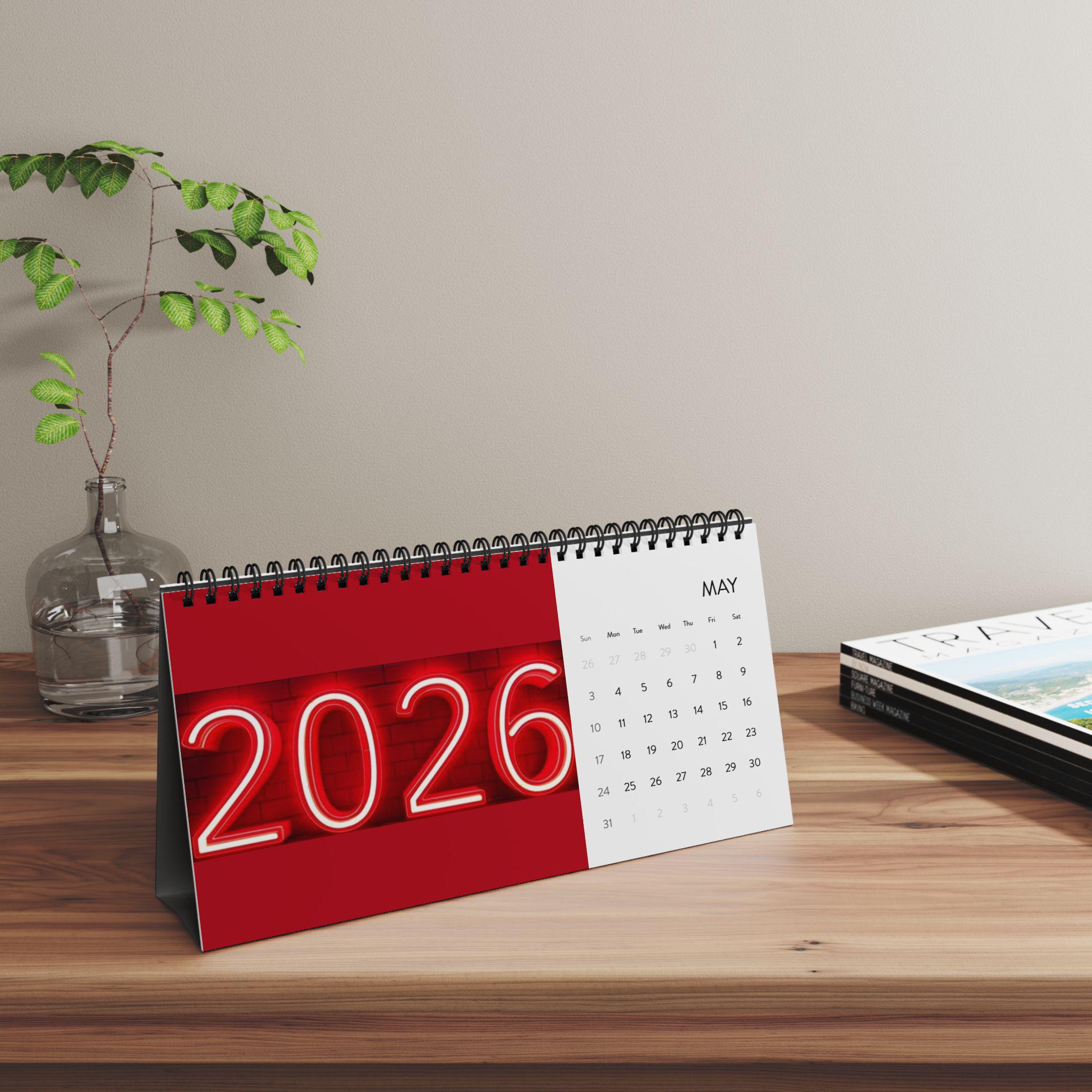 Product features - Vivid, high-resolution color printing for bright, true-to-design pages - Durable black metal spiral binding with matching tent card backing for stable desktop display - Thick 250 gsm matte paper that resists glare and takes writing well - Compact 10" x 5" size with full 2026 month grid — easy to view without crowding your desk - Printed on US-sourced paper and assembled in the USA from globally sourced parts